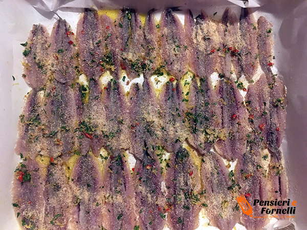 Cospargiamo in modo piuttosto uniforme le alici con il trito, poi un po’ di pan grattato e un po’ di pecorino.