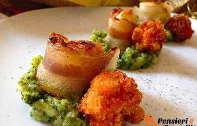 Capesante bardate su purea di broccoli e pralina di corallo 1,50 euro
