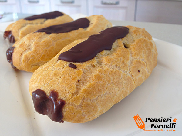 Ecco quello che a mio parere è uno degli utiizzi migliori della pasta choux. Gli eclairs, i lunghi bignè ripieni al cioccolato simbolo perenne di goduria. Per riempirli abbiamo usato una crema pasticcera al cioccolato extra, ossia con cioccolato fondente e cacao. Provate a farli e non ve ne pentirete.