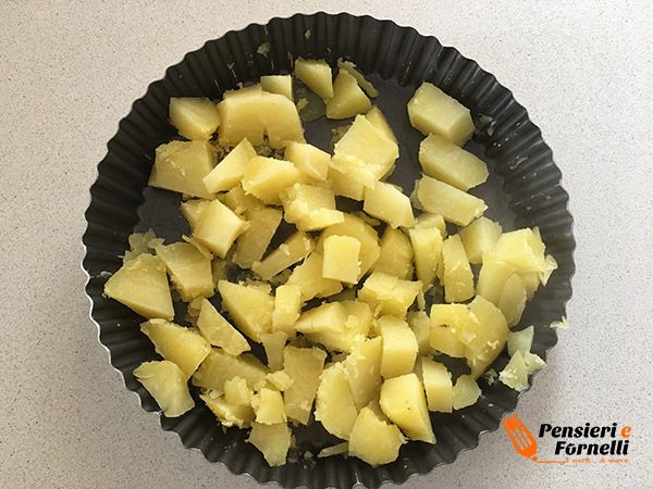 Anzitutto, laviamo le patate e lessiamole intere e con la buccia, fino a quando, infilzandole con una forchetta, non risulteranno morbide. Poi peliamole e tagliamole a pezzi grossolani, se qualcuno è più grande di altri è ancora meglio. Poniamo le patate in una teglia da forno.
