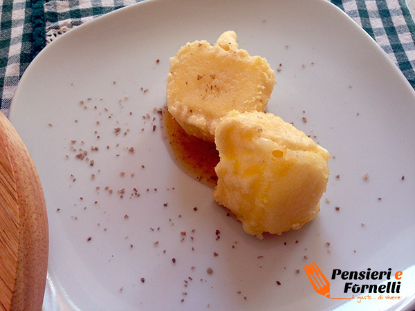 Intingiamo i cubi nella tempura e friggiamo in abbondante olio giusto il tempo di far rapprendere la crosta. Per la presenza della farina di riso, il colorito finale sarà abbastanza chiaro.