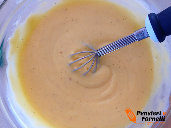 Poi mescoliamo il composto alla restante crema pasticcera, fino a che non sarà omogeneo. Stemperiamo la crema anche con il limoncello.
