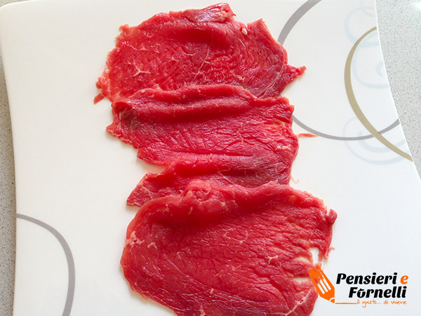 Sistemiamo nel piatto di servizio le fette di carpaccio, in modo che non si sovrappongano.