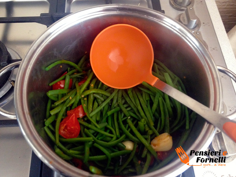 A questo punto aggiungiamo i fagiolini con un po’ della loro acqua di cottura, quanto basta perché cuociano per una ventina di minuti, ed il sugo resti lento e abbondante.