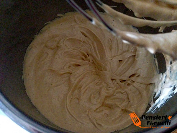 Montiamo le uova, i tuorli, gli zuccheri e gli aromi fino ad ottenere un composto spumoso e fermo.